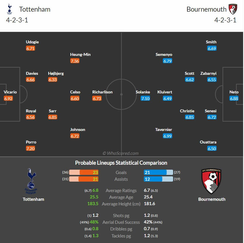 후즈스코어닷에서 토트넘 대 본머스 프리미어리그 경기 20라운드 예상 라인업 명단을 공개했습니다. 로메로의 부상으로 인한 결장과 비수마의 카드누적으로 인한 출전불가로 큰 타격이었는데, 여기에 공격의 핵심 클루셉스키마저 카드누적으로 출전하지 못합니다. 방패가 없는 토트넘의 입장에서 더욱 강한 창으로 승리해야 하는데 손흥민의 멋진 활약이 필요해진 시점입니다.