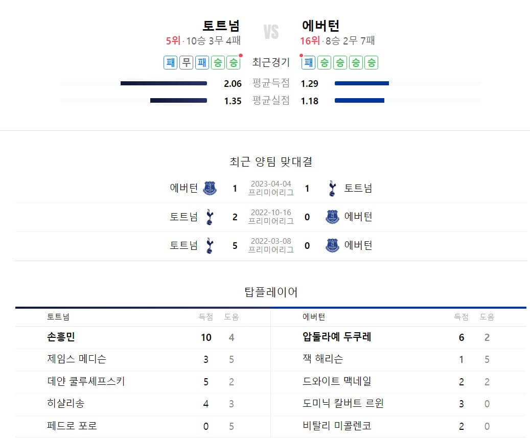 5게임 연속 선제골을 넣고도 1무 4패를 기록하던 토트넘은 히샬리송의 복귀 이후 손흥민의 왼쪽 윙 기용과 함께 리그 2연승을 기록 중이며 직전 카라바오 컵에서는 풀햄과 1:1 무승부를 기록했지만 리그 4경기 무실점 4연승을 기록한 에버튼과의 경기가 열립니다.