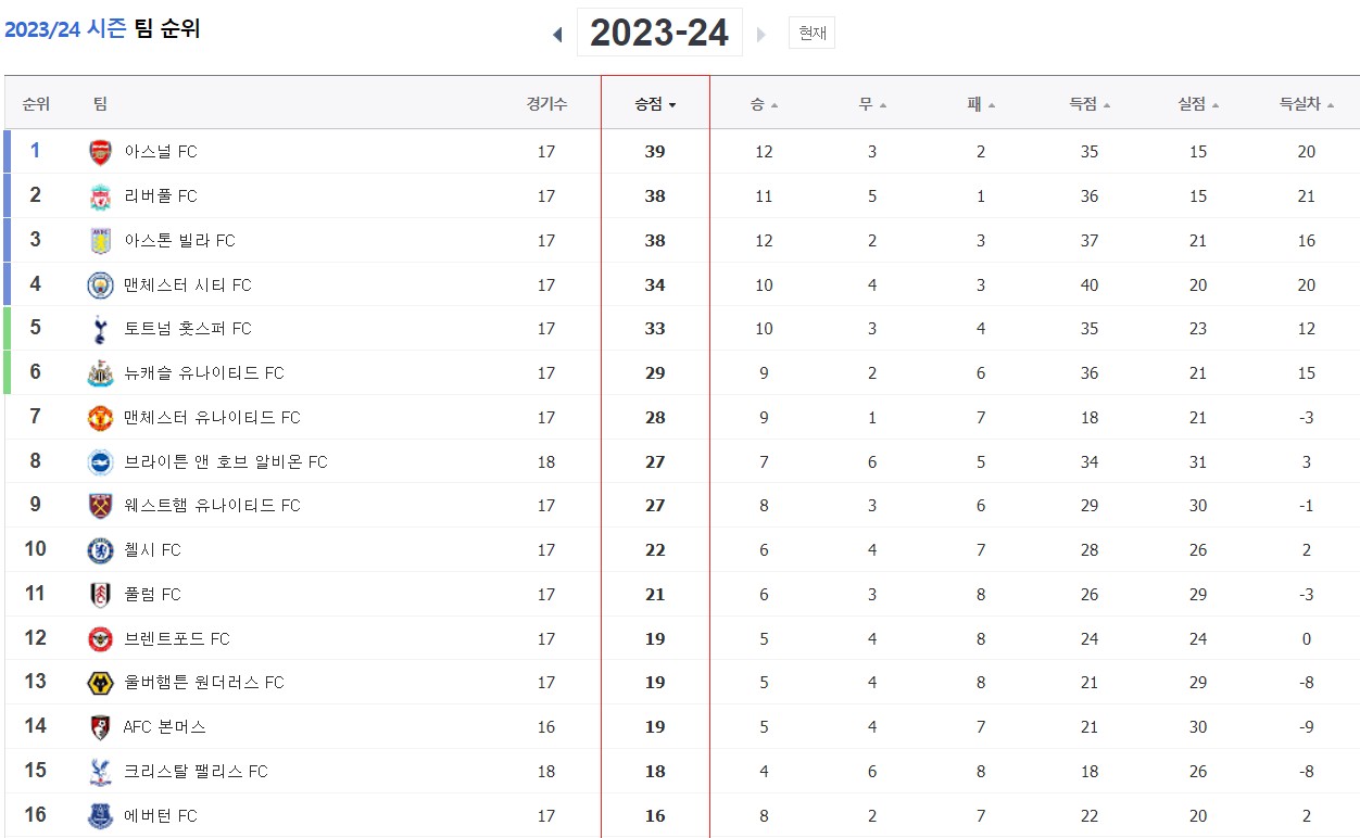 - 에버튼 : 16위 승점 16점 8승 2무 7패